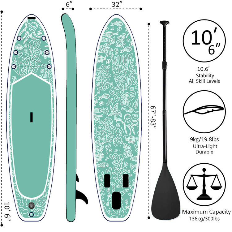 - อัพเกรดวัสดุที่ทนทาน:Huarui SUP ผลิตจาก PVC คุณภาพสูง และสร้างด้วยโครงสร้างแบบ drop-stitch ซึ่งให้ความมั่นคงและความปลอดภัยในการใช้งานเป็นเวลานานยาว 10'6” x กว้าง 32” x หนา 6” พร้อมรับน้ำหนักได้มากถึง 330 ปอนด์ การออกแบบ SUP ที่กว้างเป็นพิเศษนั้นง่ายสำหรับทุกระดับทักษะพร้อมสัตว์เลี้ยงที่จะยืนขึ้นและรักษาสมดุล